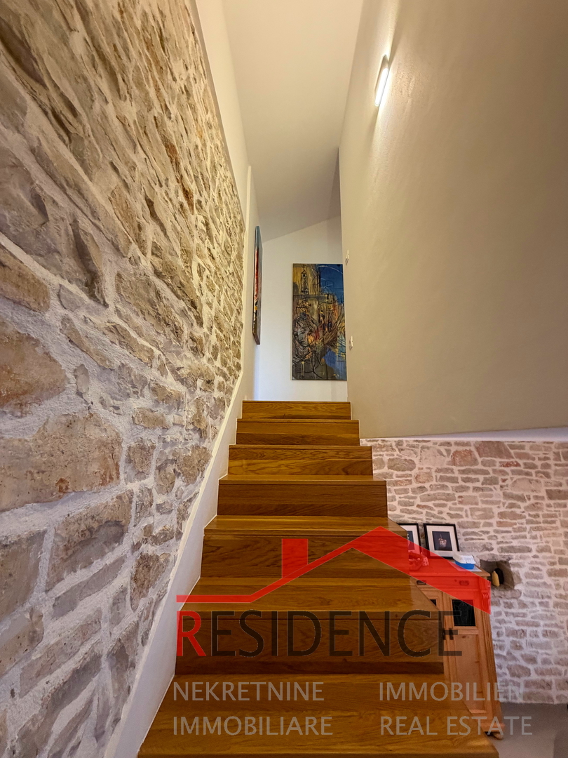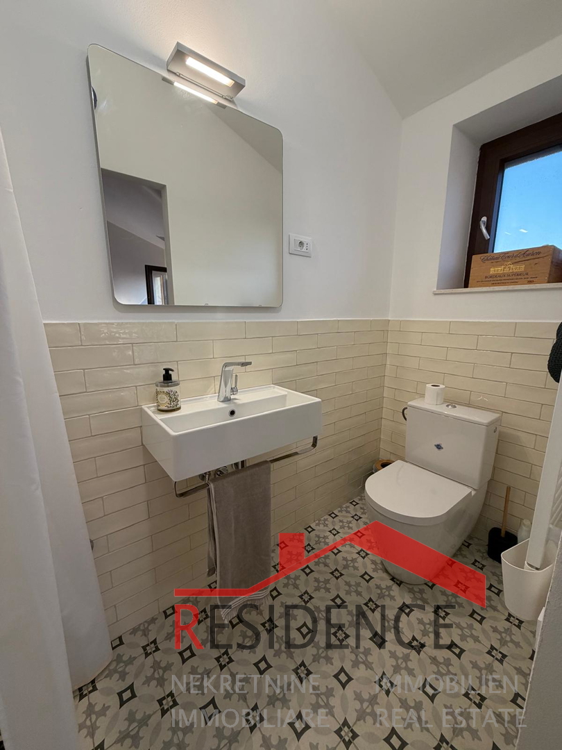 Wir verkaufen ein zweistöckiges steinhaus im zentrum von Peroj mit einer wohnfläche von 50 m2 und einer 20 m2 großen garage. Das erdgeschoss besteht aus einer küche mit ess- und wohnbereich sowie einem abstellraum. Eine eichenholztreppe führt in den ersten stock mit badezimmer und einem geräumigen schlafzimmer mit zugang zu einer terrasse mit meerblick. Das haus wurde 2022 mit hochwertigen materialien renoviert. Die garage kann auch als gastraum genutzt werden. Die fenster und türen sind aus PVC in holzoptik. Eichenholzboden und -treppe im ersten stock. Beheizt wird das haus durch klimaanlage und einen holzofen. Ein kamin ist ebenfalls vorhanden. Es liegt 300 meter vom meer und den stränden entfernt. Ruhige und friedliche lage.