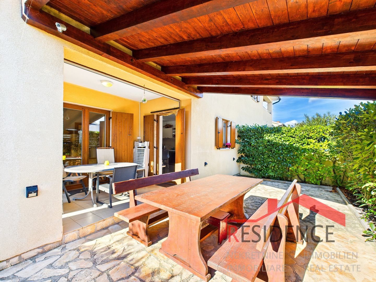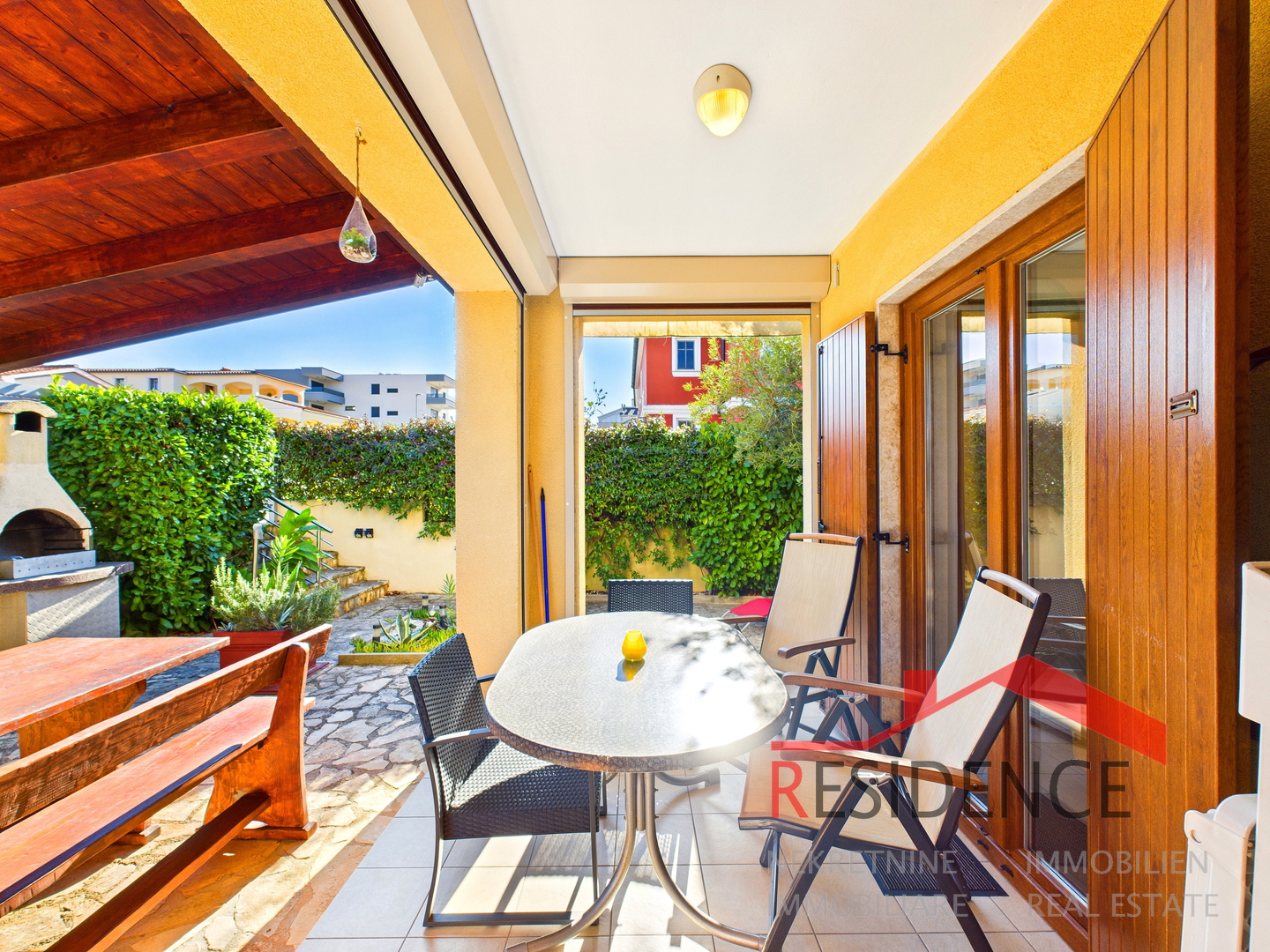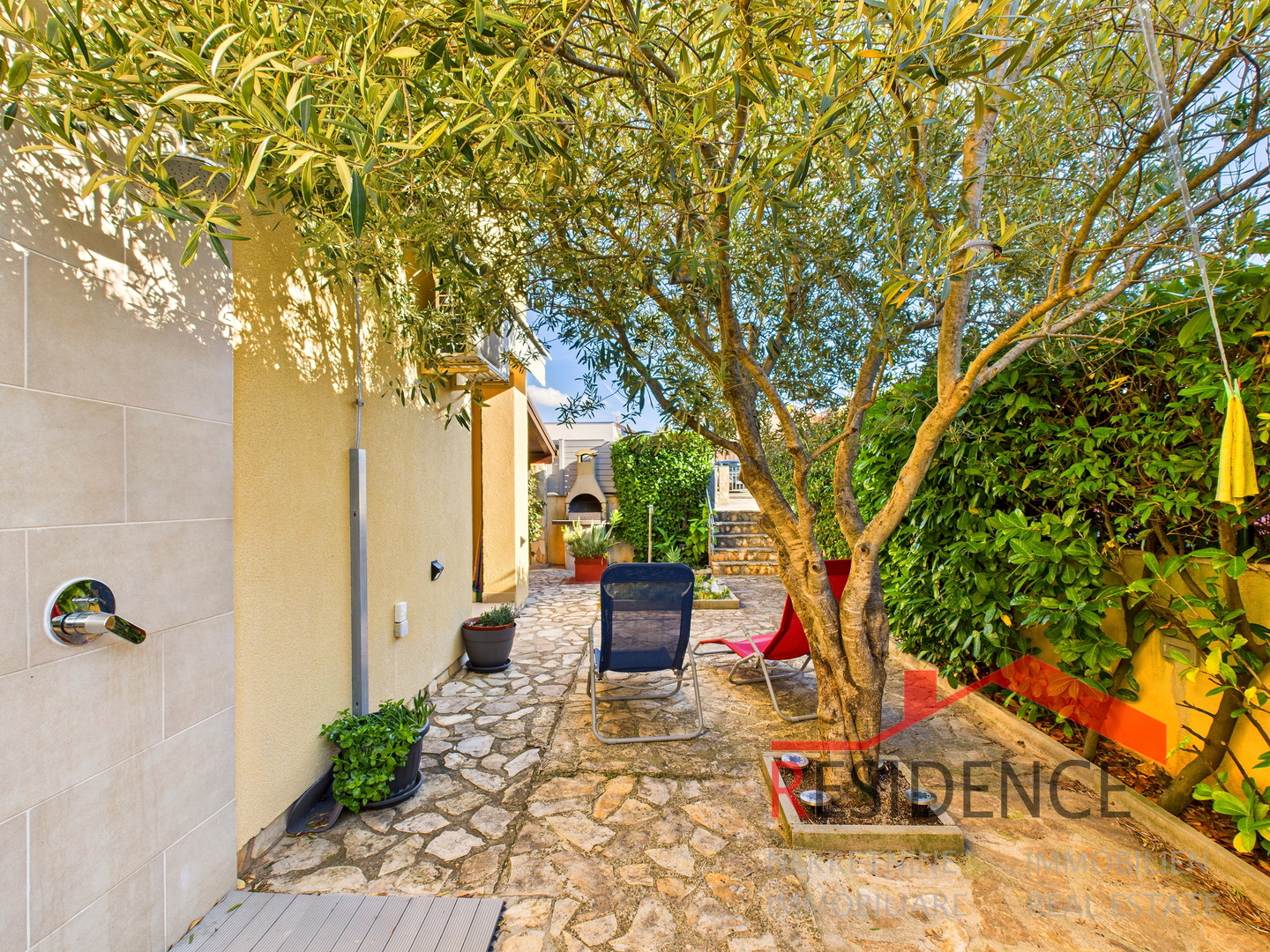 Posebna prednost ove nekretnine je privatni vrt površine cca 50 m2, koji je u naravi terasa, djelomično natkrivena, s ugrađenim roštiljem i vanjskim tušem s toplom vodom – savršeno za opuštanje i druženje tijekom cijele godine.