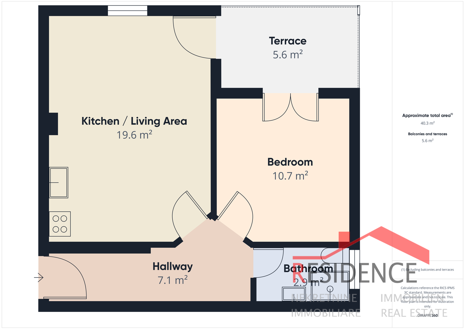 Stan se nalazi u prizemlju, ima ukupnu površinu od 44,13 m2 a sastoji se od: hodnika, kuhinje s blagovaonicom i dnevnim boravkom, loggie, kupaonice i spavaće sobe.