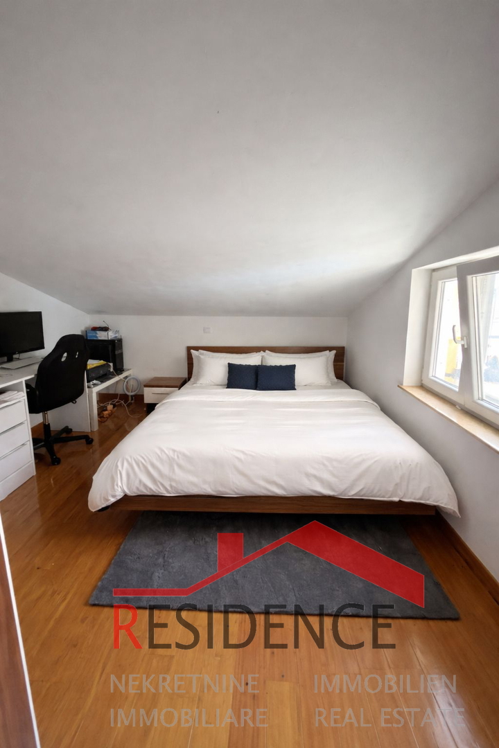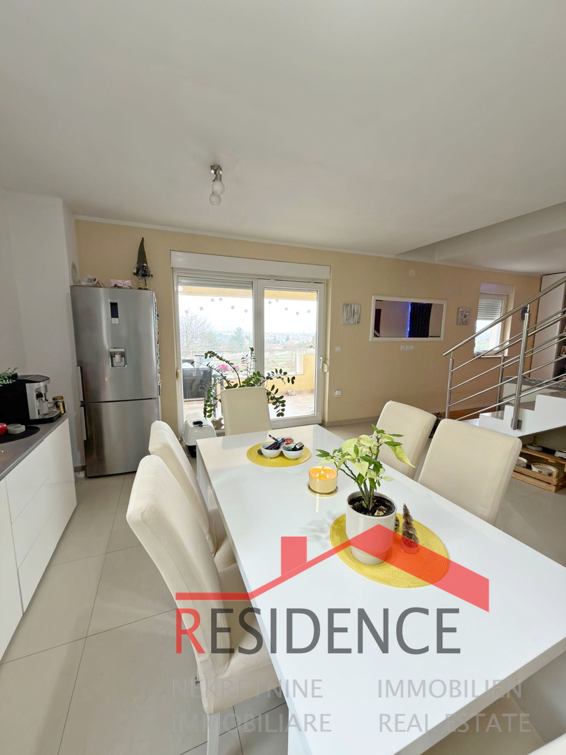 Prodajemo u Šijani lijepi dvoetažni stan ukupne površine 98,49 m2, smješten na prvom katu i potkrovlju manje stambene zgrade novije gradnje sa svega sedam stanova, raspoređenih na tri etaže (prizemlje, prvi kat + potkrovlje), što osigurava mir i privatnost stanara. Na prvoj etaži nalaze se predprostor, kupatilo, kuhinja s blagovaonicom, dnevni boravak te velika natkrivena terasa s otvorenim pogledom na grad. U potkrovlju su hodnik, drugo kupatilo, tri spavaće sobe te krovna terasa koja pruža dodatni prostor za odmor i uživanje na otvorenom. Stan je sunčan, jugozapadno orijentiran, s lijepim pogledom na grad. Grijanje i hlađenje riješeno je putem klima uređaja, a stan ima i dimnjak, što omogućuje dodatne opcije grijanja (peć ili kamin). Ugrađena je PVC stolarija, a energetski certifikat nekretnine je razreda B. Stanu pripada šupa i parkirno mjesto.Prodaje se kompletno namješten, osim bijele tehnike. Zgrada ima demit fasadu te se nalazi u mirnom dijelu naselja, idealnom za obiteljski život, u blizini svih potrebnih sadržaja. Vlasništvo je uredno, 1/1, bez tereta, te je nekretninu moguće kupiti putem stambenog kredita.
