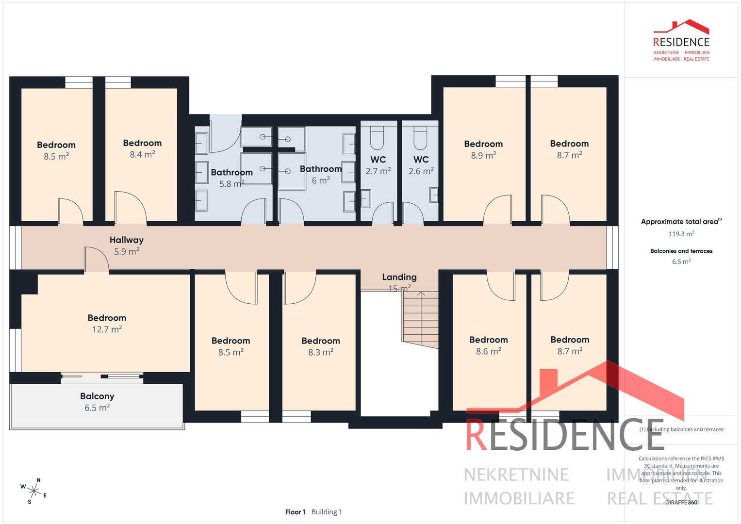 Disimpegno, otto camere da letto matrimoniali, soggiorno con accesso alla terrazza, due bagni e due WC separati - ideale per ospitare un gran numero di ospiti o partecipanti ai programmi.