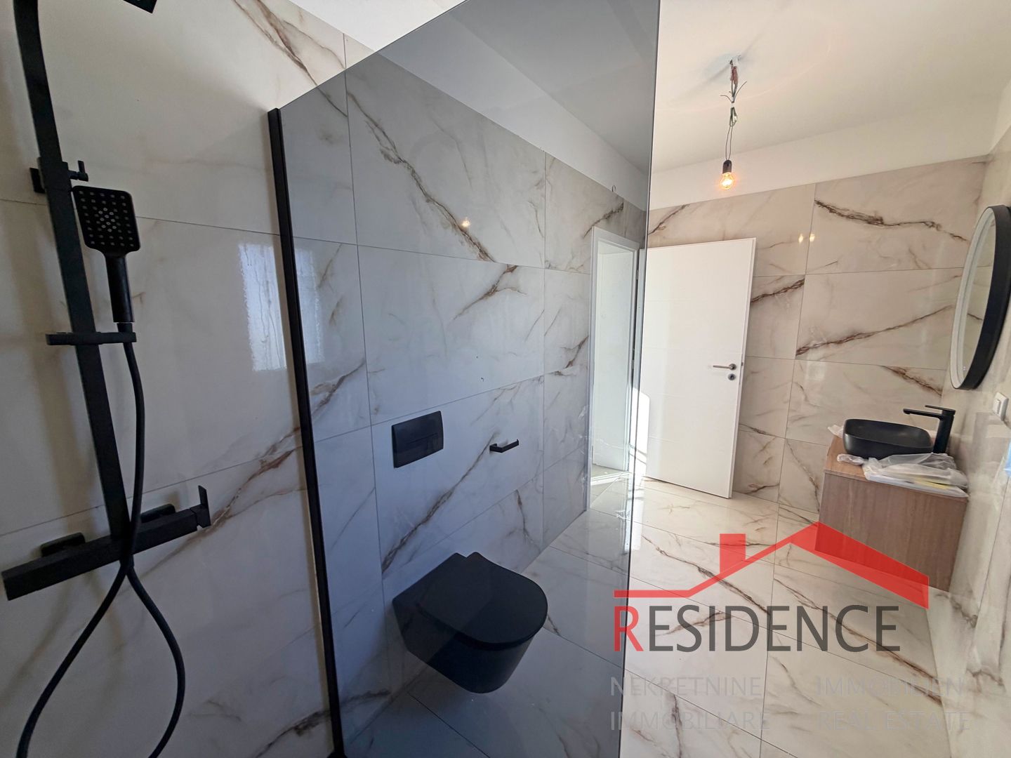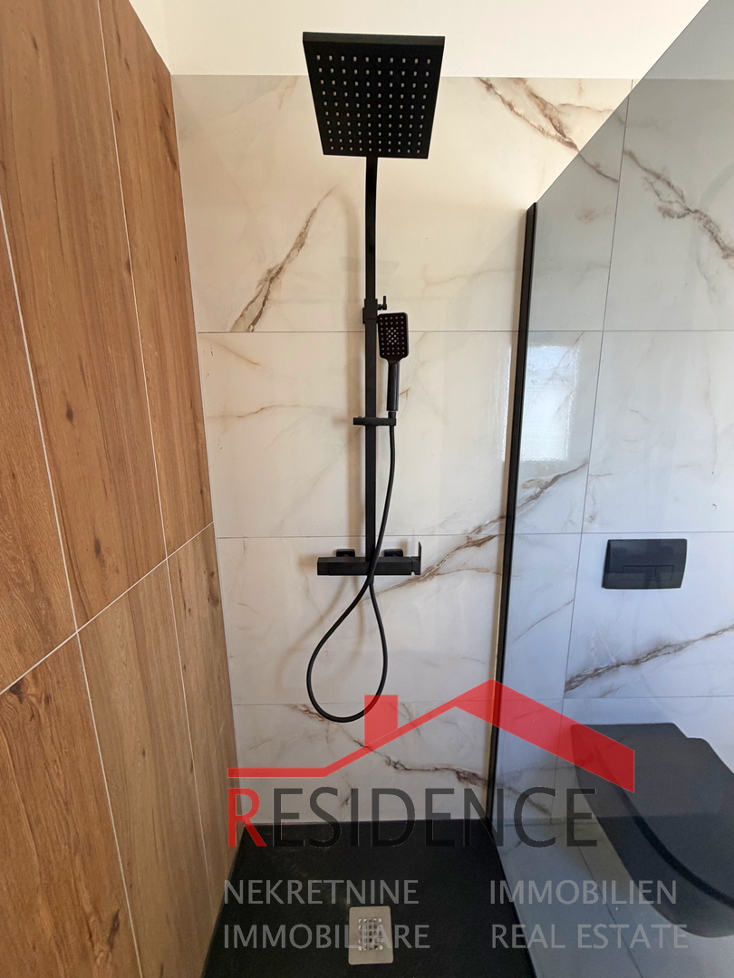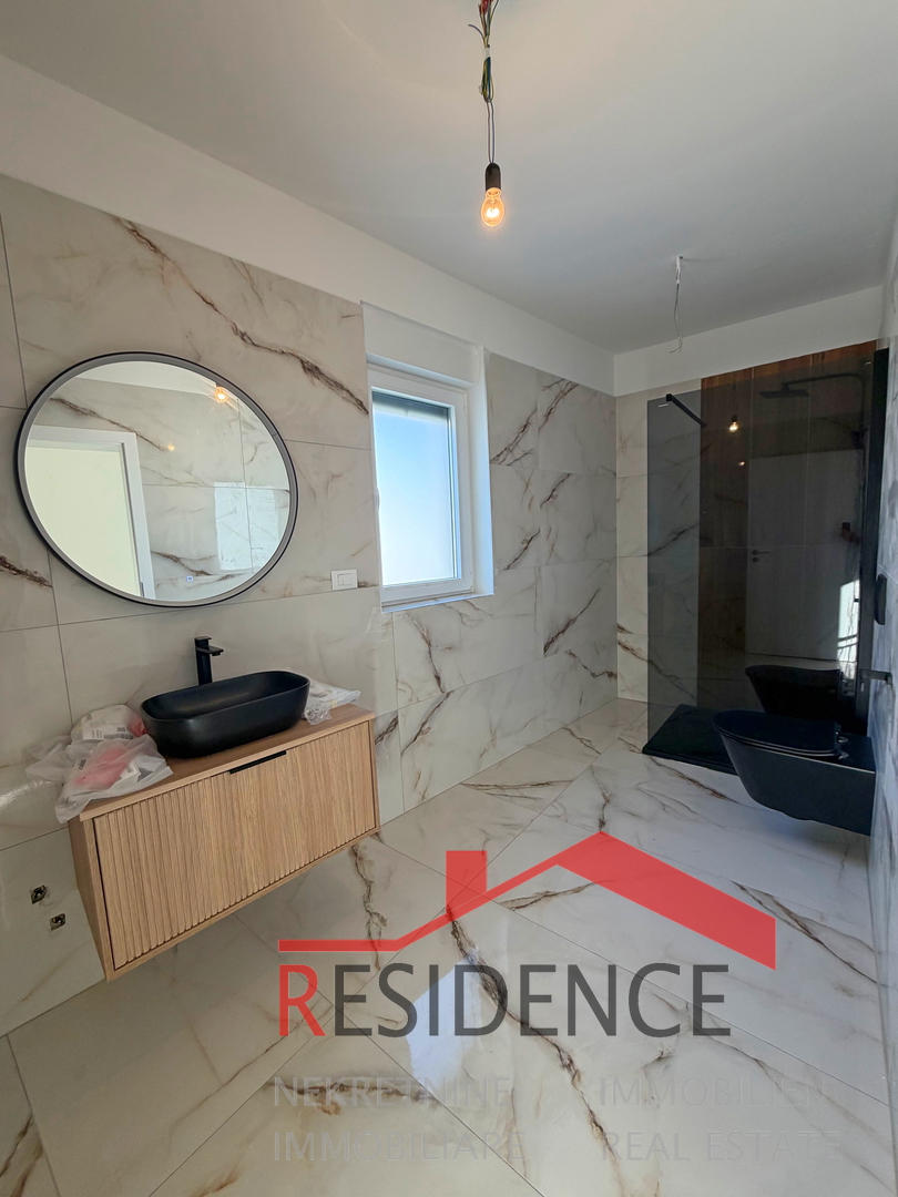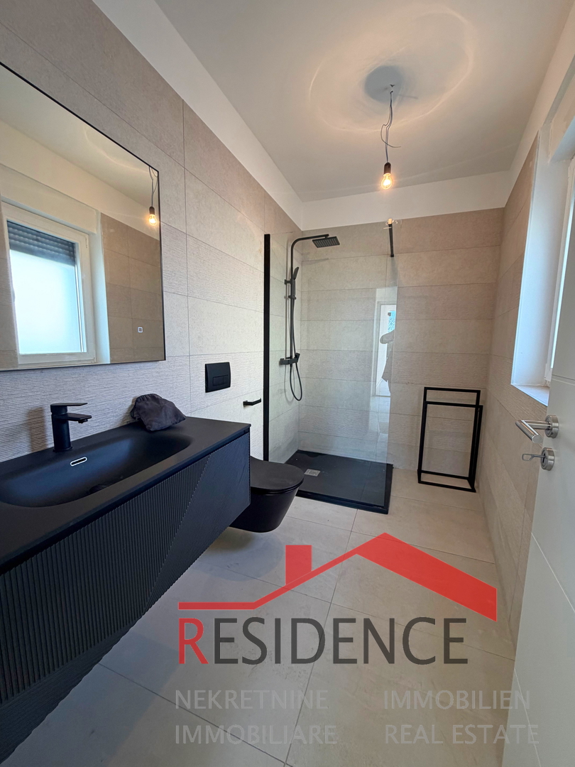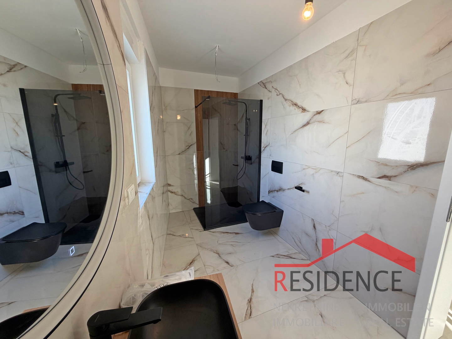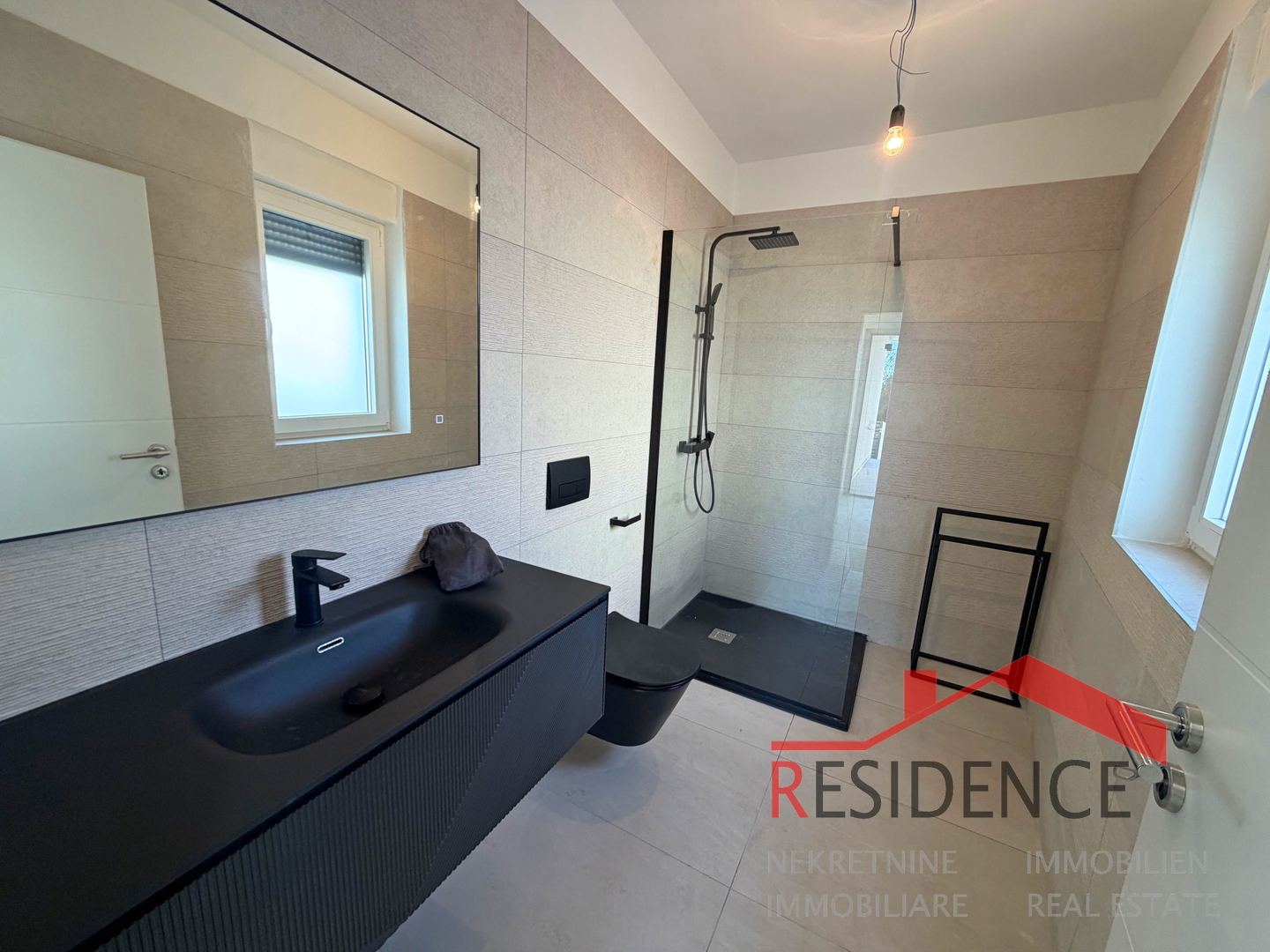Prodajamo moderno dvojno hišo z bazenom na čudoviti lokaciji v Ližnjanu. Hiša ima površino 180 m2 in je v dveh nadstropjih. V pritličju je predsoba, kopalnica, shramba, kuhinja z jedilnico, prostorna dnevna soba z dostopom do pokrite terase in vrta z bazenom, notranje stopnice pa vodijo v prvo nadstropje, kjer se nahajajo hodnik, kopalnica in tri spalnice, od katerih ima ena teraso s pogledom na morje. Vse sobe so klimatizirane. Orientacija: vzhod-zahod-jug. Velikost bazena 31,50 m2. 2 parkirni mesti. Oddaljenost od morja 1.400 metrov.